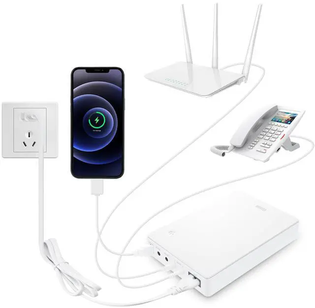 Mini uninterrupted power supply for power outage, compatible with router, modem, security camera, telephone, fax, printer, fingerprint recorder, LED strip lights, ect, and can still use the network in case of power outage.