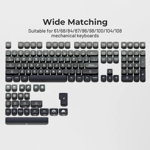 Widely CompatibilityThis keyboard key caps consists of 143 keycaps, including 104 standard keys and 39 modifiers keys, compatible with most ASIN US and UK layout 61/64/68/84/87/96/98/100/104/108 mechanical keyboards.