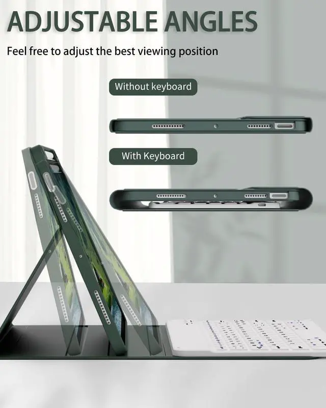 Multiple Viewing and Pencil Holder Keyboard Case 11"-the keyboard is magnetically attached and very versatile and the thoughtful design easily adjusts to whatever comfortable angle suits you best. That makes the IPad work like a laptop, so it's perfect for working, typing and editing or watching videos. It has a pen slot inside to prevent the apple pencil from being lost, grab your Apple Pencil, Pencil Cap and Adapter effortlessly whenever you want, easily to carry your with your device.