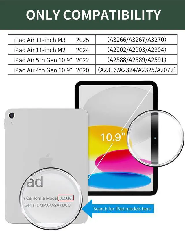 Compatibility iPad Air 11 inch Case with Keyboard iPad keyboard case is designed for iPad Air 6th Generation 2024Model: A2902/A2903/A2904), Air 5th Generation 2022 10.9 inchModel: A2588/A2589/A2591), Air 4th Generation 2020 Model: A2316/A2324/A2325/A2072). It is Not compatible with any other devices. Please check back bottom of your iPad to find the model number.