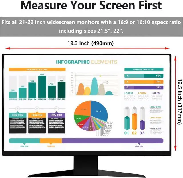 Privacy Filter Dimensions - Privacy Screen Fits 21 inch to 22 inch, 21"-22" widescreen monitors with a 16:9 or 16:10 aspect ratio. Actual Filter Size: Width: 19 19/64" (490mm), Height: 12 1/2" inches (317mm). Compatible with HP Dell Acer Samsung LG ViewSonic and More. The length and width may not be a perfect fit, so the filter may be a little longer and wider.