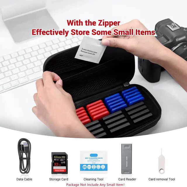Double protection: Made of EVA and PU materials, which are comfortable & durable, effectively reducing the risk of data loss caused by memory card collision damage; With waterproof zipper, waterproof and oil proof; The plastic transparent case is equipped with a snap on cover, which has ideal sealing performance. (Note: The zippers may experience some stuttering when opened, but it does not affect normal use!!!!)