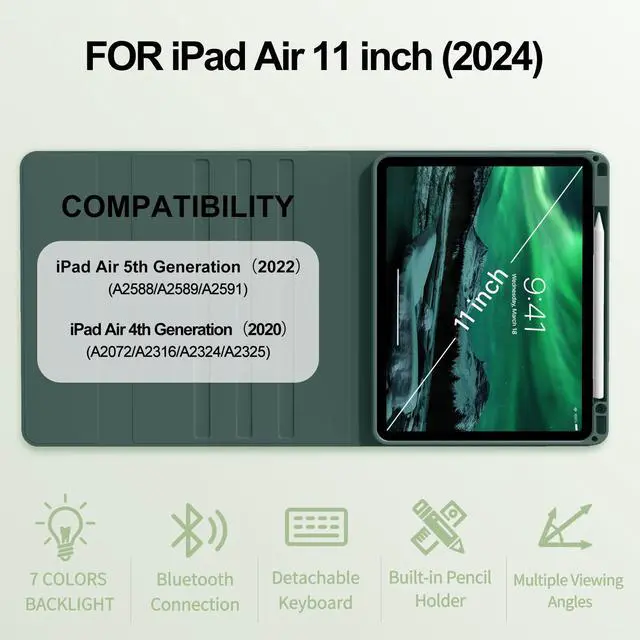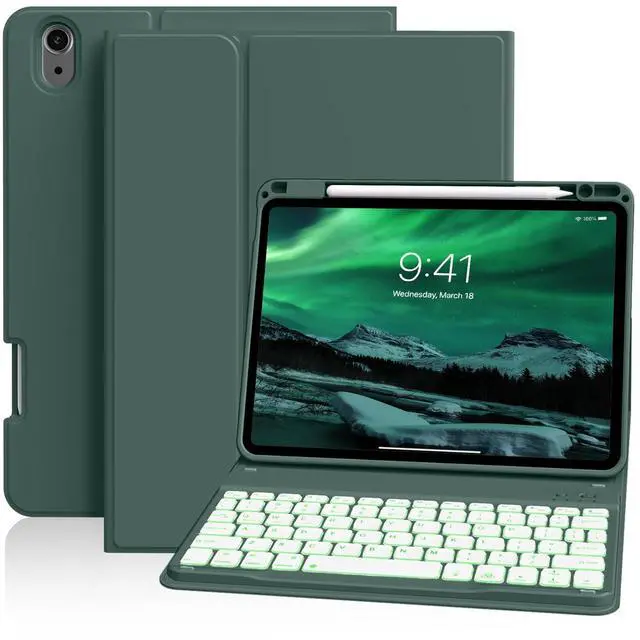 aoub Keyboard Case for iPad Air 11 inch M3 (2025) / M2 (2024), iPad Air 5th/4th Generation 10.9 inch 2022/2020-7 Color Backlit Detachable Keyboard, Stand Folio Cover with Pencil Holder, Dark Green