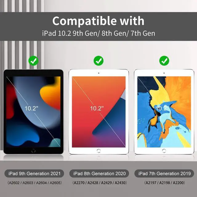 Precision Compatibility Our Keyboard Case Designed for 10.2 inch iPad 2021 9th Generation (Model Number: A2602 A2603 A2604 A2605) & iPad 2020 8th Generation (Model Number: A2270 A2428 A2429 A2430) & iPad 2019 7th Generation(Model Number: A2197 A2198 A2200). Please Note: Not compatible with any other iPad models.