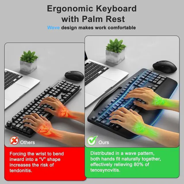 Ergonomic Keyboard and Mouse: Keyboard features an ergonomic wave design and a 2.8-inch palm rest, naturally fitting the fingers and providing the most comfortable typing posture. Mouse is designed with a palm-curved shape and a perfect grip angle, effectively alleviating wrist fatigue caused by prolonged use.