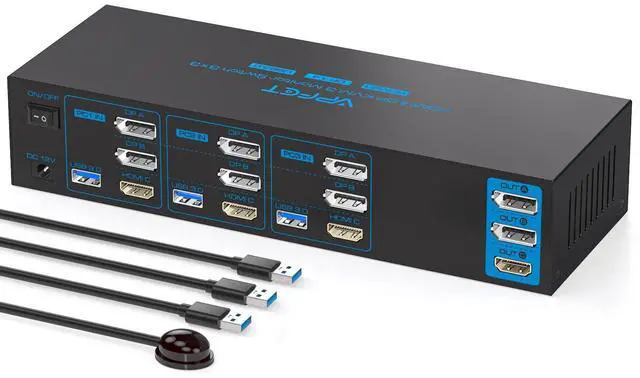 4K144Hz Displayport KVM Switch 3 Monitors 3 Computers 1 HDMI 8K30Hz KVM Switches Triple Monitor for 3 PC Share 3 Screens and 4 USB 3.0 Ports with Power Adapter and USB Cables