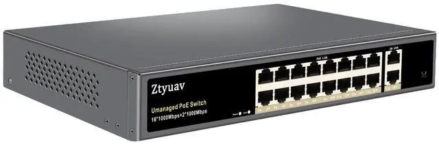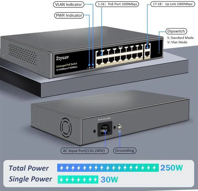 All Gigabit Ports: This PoE switch is equipped with 16 PoE ports, 2 UpLink port, 100/1000Mbps each, supporting bandwidth up to 12Gbps and total PoE budget up to 250W, offering high-speed network expansion.