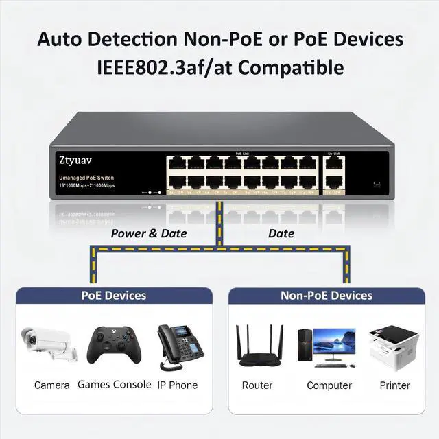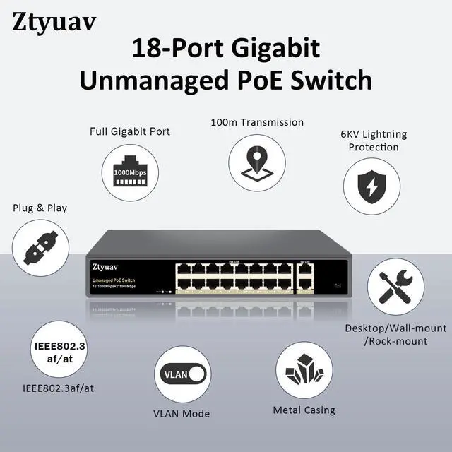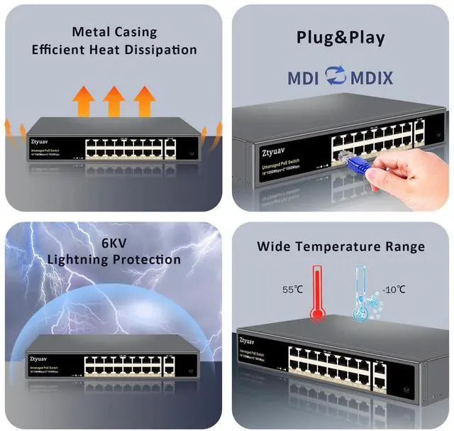 Standard PoE Switch: IEEE802.3af/at compatible and PD auto detection, which can automatically detect adaptive PoE devices and provide required power for them, while protect non-PoE devices from being damaged. And the switch provide 6KV lightning protection, withstand the impact of lightning strikes.