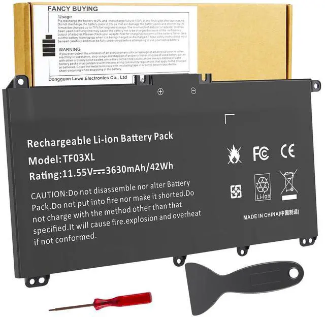 • Specifications Model: TF03XL; Battery Type: Lithium polymer; Voltage: 11.55V; Capacity: 42Wh; Cells: 3 cells; Color: Black with Two Free Screwdrivers for easy installation. 920070-855 Battery for HP Pavilion 15-CC 15-CD 15-CK 14-CD 14M-CD 14-BF 14-BP 14-BK 17-AR Series