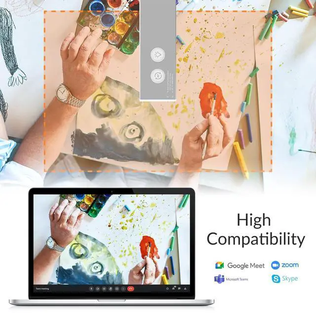 2-in-1 Document Camera and WebcamThe adjustable stand design enables flexibility to shoot overhead as doc-cam, or front-facing as web camera for video calls. Perfect for hybrid learning, online coaching, live demo, and video conferencing.