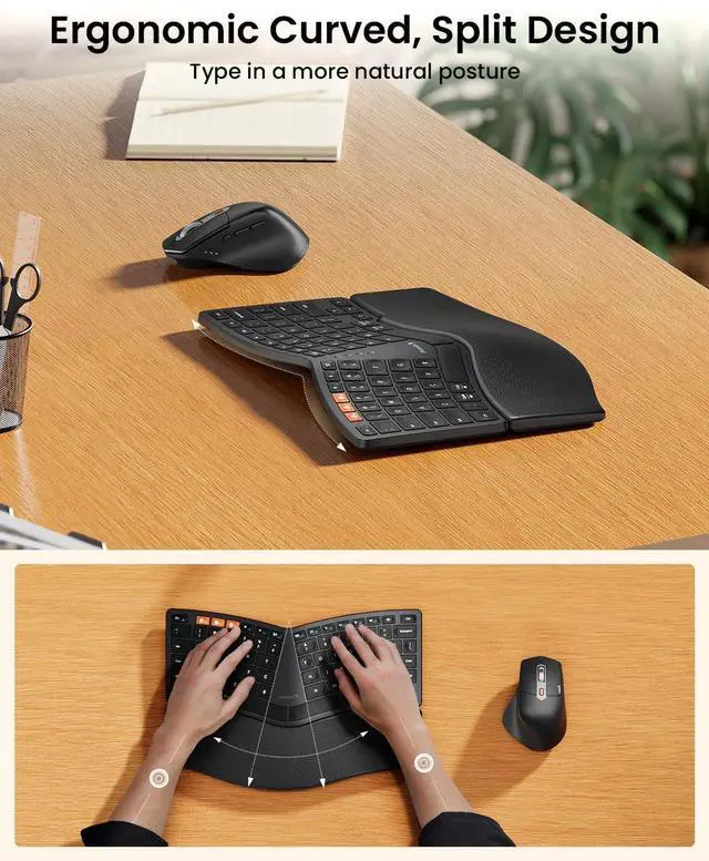 Compact Ergonomic Keyboard: Features with compact 80 keys, curved and split keyframe. Compact layout without number pad enables you to position the mouse closer to your body, promoting a more natural shoulder alignment for enhanced comfort. The EKM04 mini compact ergonomic keyboard mouse offers a space-saving solution to maximize workspace efficiency without sacrificing comfort and functionality. Kindly Note: The ergonomic keyboard doesn't have 10-key number pad.