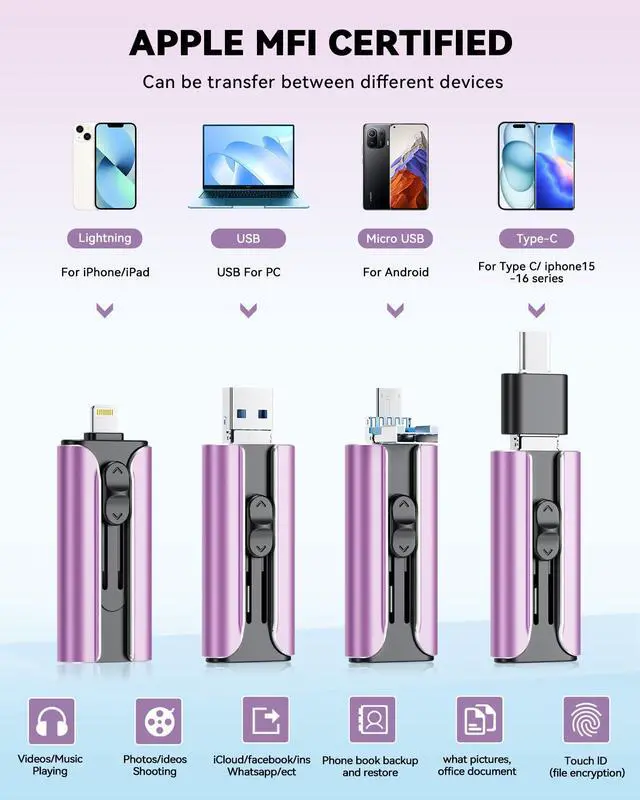 Multi-port USB Drive: The usb stick has four interfaces, USB, Lightning, Micro USB, and Type-C (standalone adapter), which makes multi-device data transfer convenient. Get rid of the data cable, iTunes, and iCloud, easily switch storage spaces, and no need to worry about iPhone storage shortage! You can also back up files to the computer via USB port for more secure file storage.