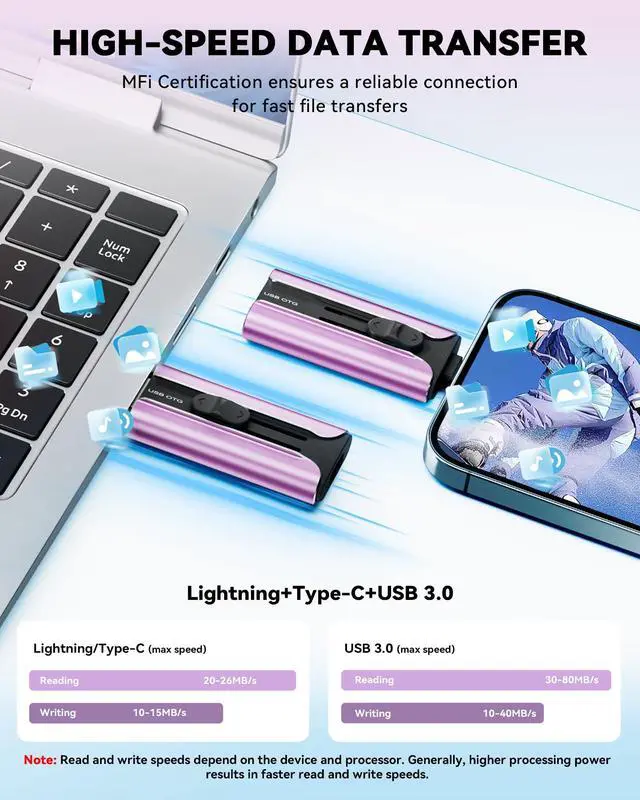 MFi Certified High-quality iPhone Flash Drive: This usb flash drive for iphone is MFi certified, made with high-quality frosted aluminum and advanced chip technology to ensure excellent performance. Its unique retractable design and attached keychain add portability, protecting the connector from damage when not in use and reducing the risk of loss. (Note: iPhone users should download the required app from the App Store before use, while Android users simply need to enable the OTG function.)