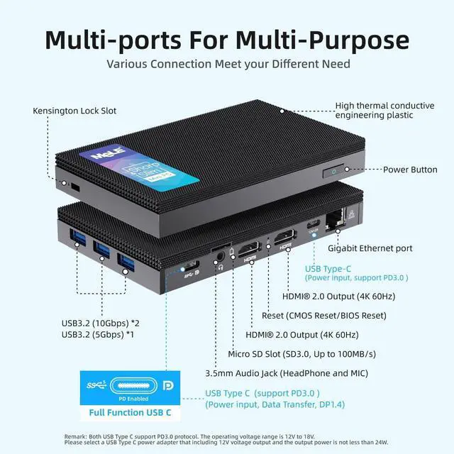 Upgraded Full-Function USB Type-C interfaceUSB Type-C (DP1.4 ) interface supports 4K UHD graphics output, data transmission (USB3.1 Gen 1=5Gbps) and power input(With PD3.0 protocol ,12-18V), all in one cable. MeLE Quieter 3C fanless mini pc supports bidirectional power supply, increase charging power supply options. Equipped with 2.4GHz/5GHz WiFi AC9560 (TX/RX Streams 2T2R, Support 160MHz Band, Max Speed 1.7Gbps) and BT5.1.
