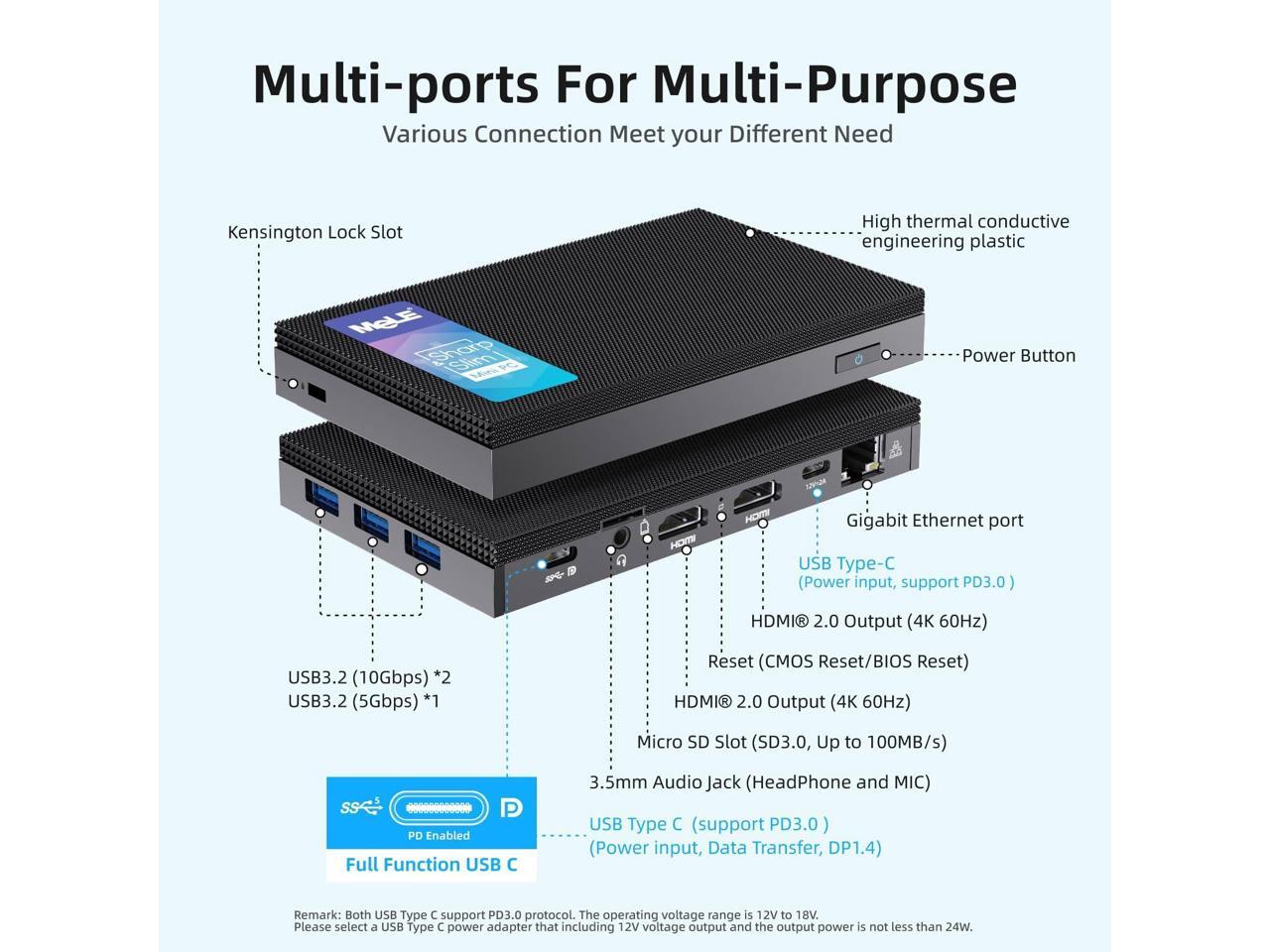 - Upgraded Full-Function USB Type-C interfaceUSB Type-C (DP1.4 ) interface supports 4K UHD graphics output, data transmission (USB3.1 Gen 1=5Gbps) and power input(With PD3.0 protocol ,12-18V), all in one cable. MeLE Quieter 3C fanless mini pc supports bidirectional power supply, increase charging power supply options. Equipped with 2.4GHz/5GHz WiFi AC9560 (TX/RX Streams 2T2R, Support 160MHz Band, Max Speed 1.7Gbps) and BT5.1.