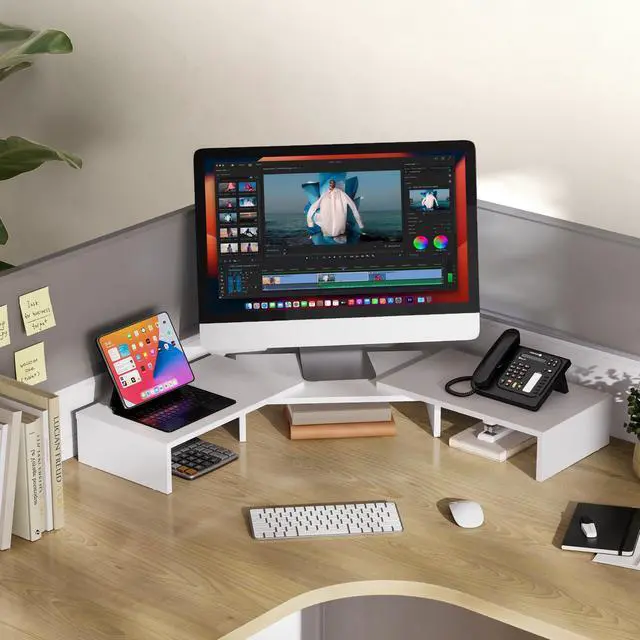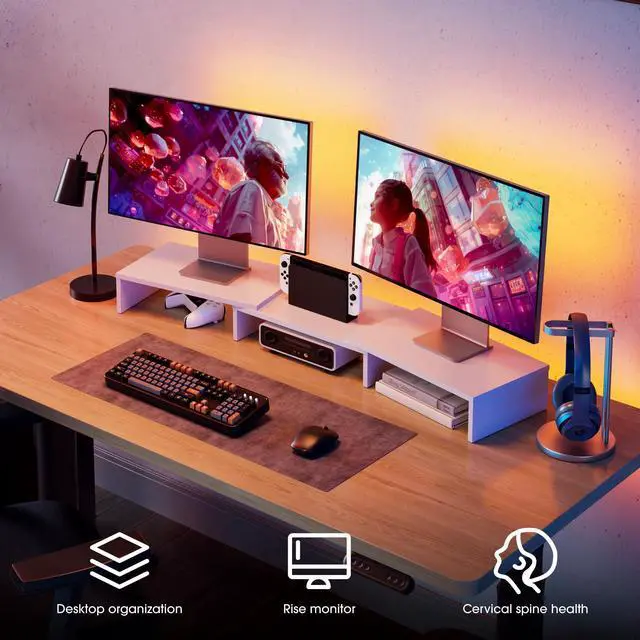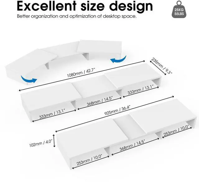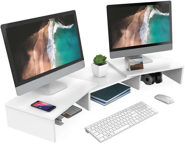 Longer Size with More SpaceAt longest 42.7inch wide, this laptop riser is big enough to support two monitors. Depending on your setup, you may even have room to place a speaker or another device in the middle. Creates enough space underneath for smaller desk essentials, or to tuck your keyboard and mouse away.