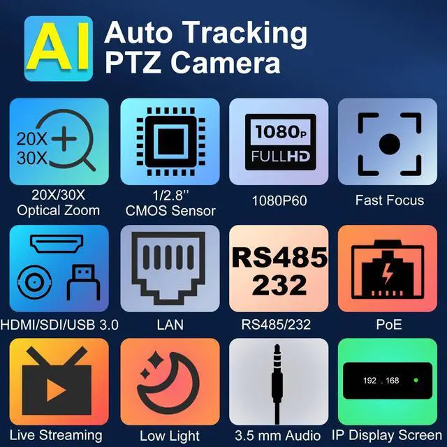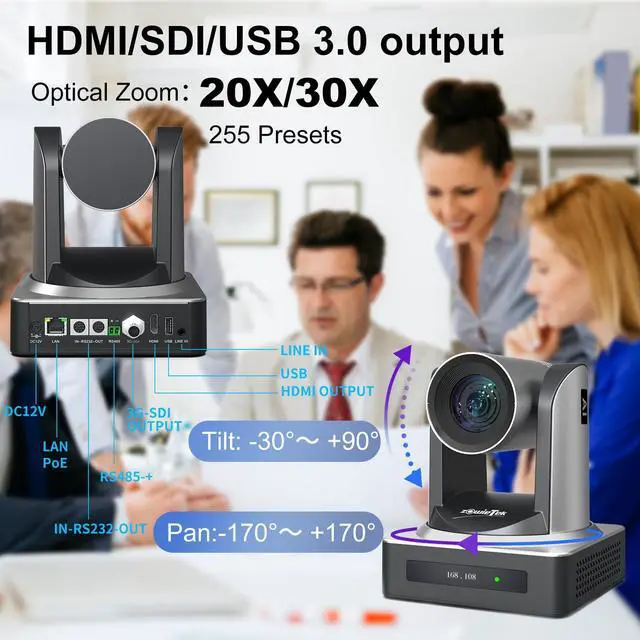 1080P60 Full HD with True-to-Life Colors: This PTZ Camera capture every detail in stunning Full HD with smooth 60fps and 30X optical zoom. Ultra-silent PTZ motor ensures distraction-free operation in any venue.