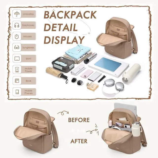 Upgrade DesignThis upgraded travel backpack not only features multiple compartments and pockets, but also has a hidden anti-theft zipper pocket inside. Compared with other daily backpacks, this upgraded version has more practicality. Let it be your daily backpack! It can hold daily necessities such as laptops, ipads, headphones, books, clothes, water cups and umbrellas, and all of them can be neatly organized.