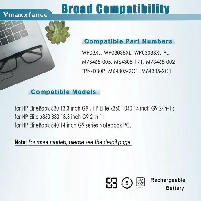 WP03XL Laptop battery Compatible laptop Modelsfor HP EliteBook 830 13.3 inch G9 , HP Elite x360 1040 14 inch G9 2-in-1 ,HP Elite x360 830 13.3 inch G9 2-in-1,HP EliteBook 840 14 inch G9 series Notebook PC.