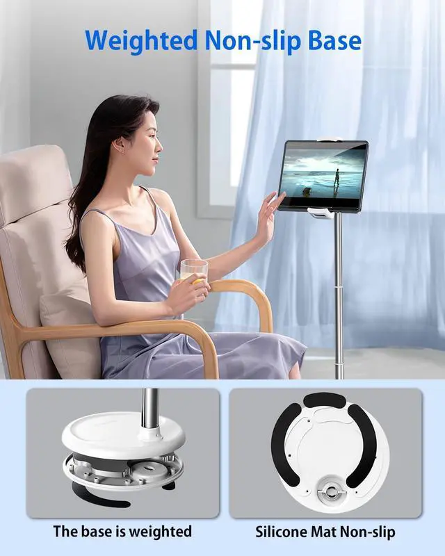 Sturdy & Secure: Sturdy smooth aluminum crafted column, stable counterweight round base with anti-slip silicone pads, balance of gravity design and sturdy structure support screen touching stable when enjoy your viewing experience
