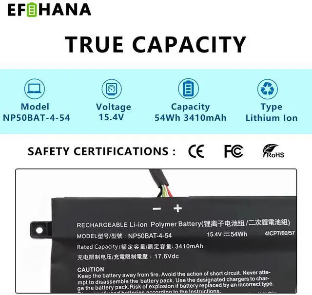 SpecificationsModel:NP50BAT-4-54 // Battery type: Li-ion // Voltage: 15.4V// Capacity: 54Wh 3410mAh// 100% New from Manufacturer. Top circuit boards and smart chip.
