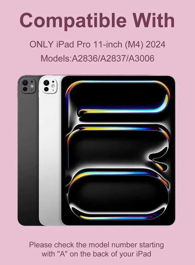 Keyboard Case for iPad Pro 11-inch (M4): This keyboard case ONLY compatible with iPad Pro 11 inch (M4) 2024 (Model: A2836 / A2837 / A3006). It is Not compatible with any other models. Please check the model number starting with "A" on the back of your tablet before purchasing