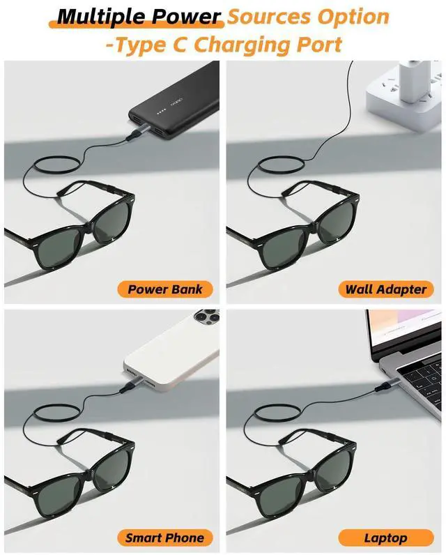 Multiple Power Source Option With Type C charging port, support various sources such as power charger, power bank and smart phone, convient to charge your Meta Glasses any where any time