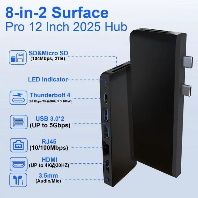 Designed for Surface Pro 12: Our Surface pro 12 hub specifically developed for Microsoft Surface Pro 12 inch (2025)! This dedicated 8-in-1 Surface Pro 12 inch docking station expertly transforms dual USB-C ports into a comprehensive workstation. It features a 4K@30Hz HDMI port, a Thunderbolt 4 port (40Gbps Data, 4K@60Hz Display, 100W PD Charging), 2*5Gbps USB 3.0 ports, 100M RJ45 Ethernet, 480Mbps SD/TF card readers and a 3.5mm audio jack. Note: Please remove the Surface Pro 12 protective case when using for better connection
