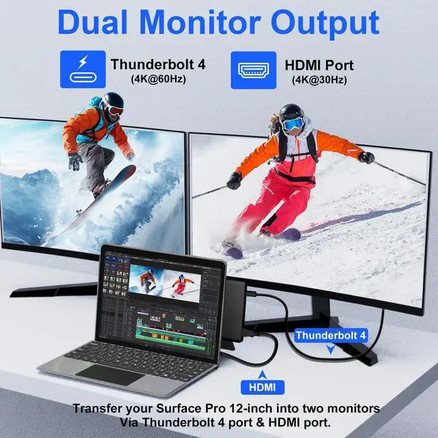 Crystal-Clear 4K Triple Display Productivity: The HDMI port supports a resolution of 4K@30Hz while the thunderbolt 4 port supports 4K@60Hz. Connect to both simultaneously to enjoy crystal-clear streaming or mirroring across 2 displays. You can connect your Surface Pro 12 to TV, monitor or projector etc, transmitting high-quality images, any switch between office and entertainment.