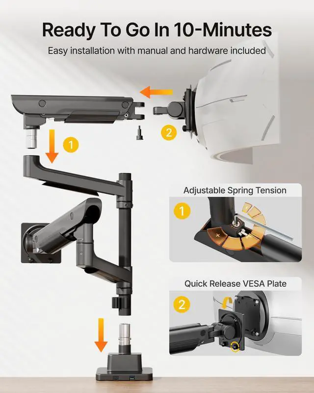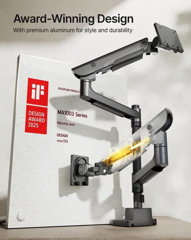 Award-Winning Design & Premium Aluminum BuildCrafted from high-grade aluminum and honored with an iF Design Award, this monitor arm blends exceptional durability with refined aesthetics. The hidden gas spring tension port ensures a sleek look while enabling long-term strength and performance.