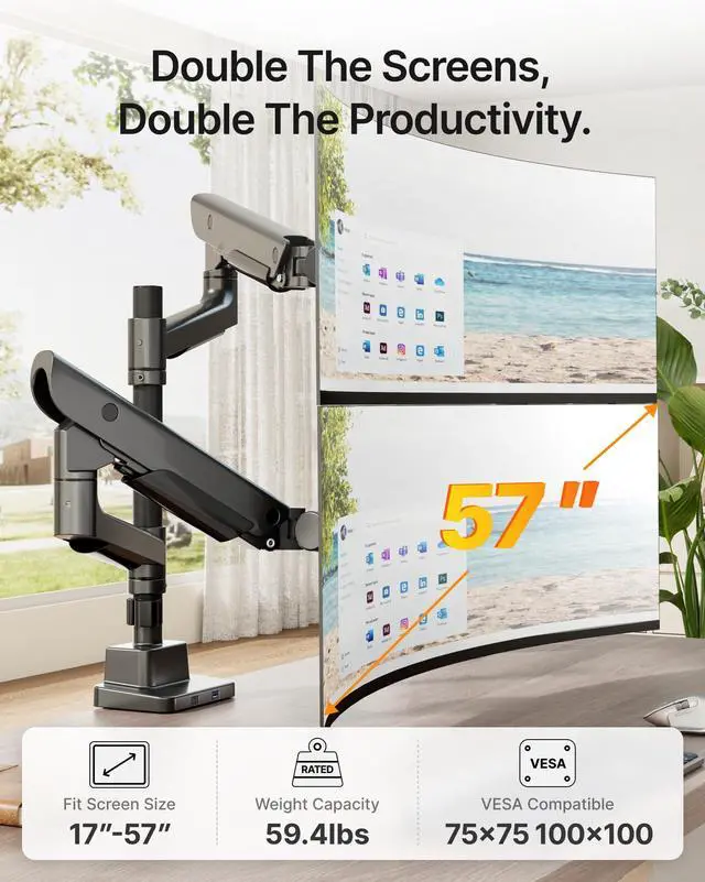 Ultra-Stable Support up to 59.4 lbs & 57 DisplaysSupports monitors from 17" to 57" and up to 59.4 lbs, including ultrawide and curved displays. Compatible with both 75x75mm and 100x100mm VESA mounting patterns, this arm ensures a rock-solid hold and flexible adjustment for even the largest screens in your setup.
