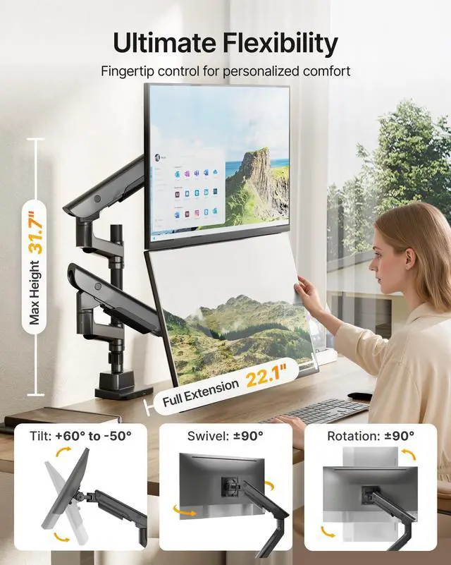 Ultra-Wide Flexible AdjustmentEnjoy effortless ergonomic tuning with tilt from +60° to -50°, ±90° swivel, and ±90° rotation. The upgraded one-way bearing head structure enables smoother motion and precise control. Extend the arm up to 19.1 or lift it to a max height of 21.9 with ease.