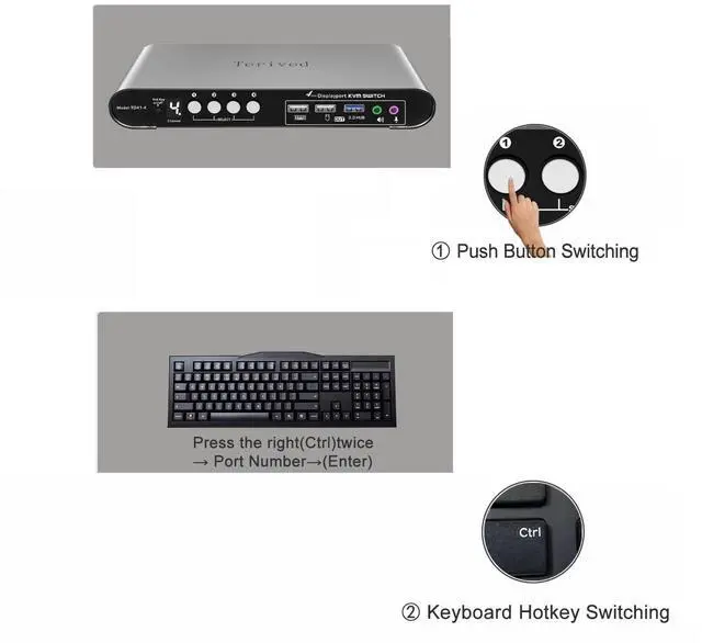 Hotkey - Tired of a manual button switch? This 4 computers 1 monitor dp KVM gives you a convenient way to switch with Keyboard shortcut: press the right [CTRL] key twice, then press [1, 2, 3, or 4], followed by [Enter] to choose a computer.