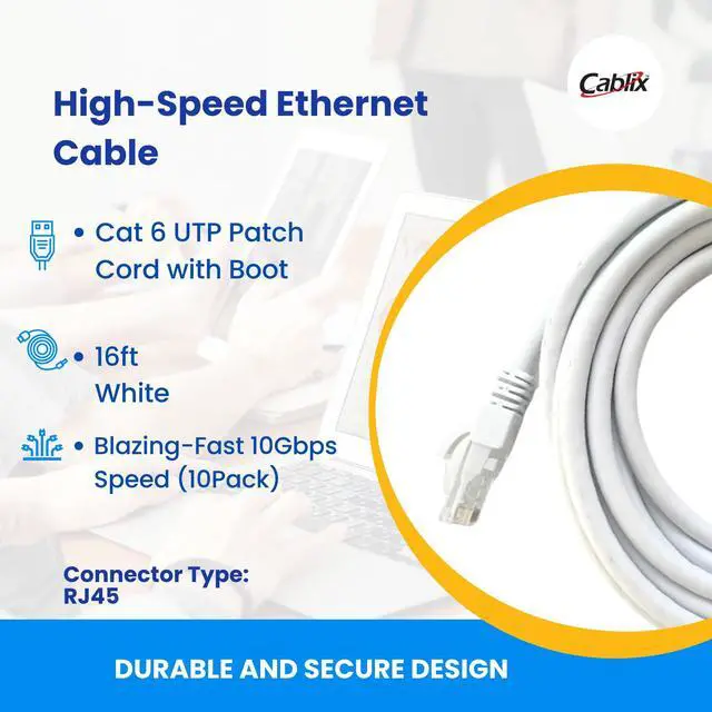 Cablix Cat 6 Ethernet Cable, 10-Pack, Patch Cord with Boot, High-Speed 10Gbps LAN Cable for Internet, Networking, Router, Modem, Switch, Printer, Servers, IT Data Center, PC, Xbox, PS5 (White, 16 ft)