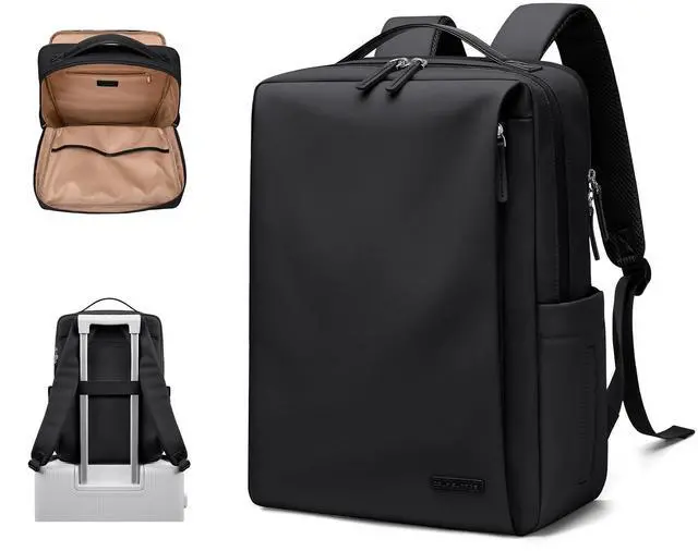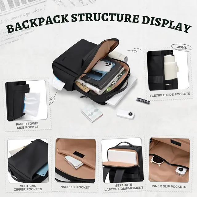 Spacious & Organized This 16L backpack features a roomy main compartment with an inner zipper pocket, 2 slip pockets, and a separate padded laptop compartment that fits up to a 15.6" laptop. External features include 2 front zippered pockets, 1 side pocket, 1 tissue side pocket, and 1 rear luggage strap for added convenience.