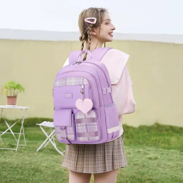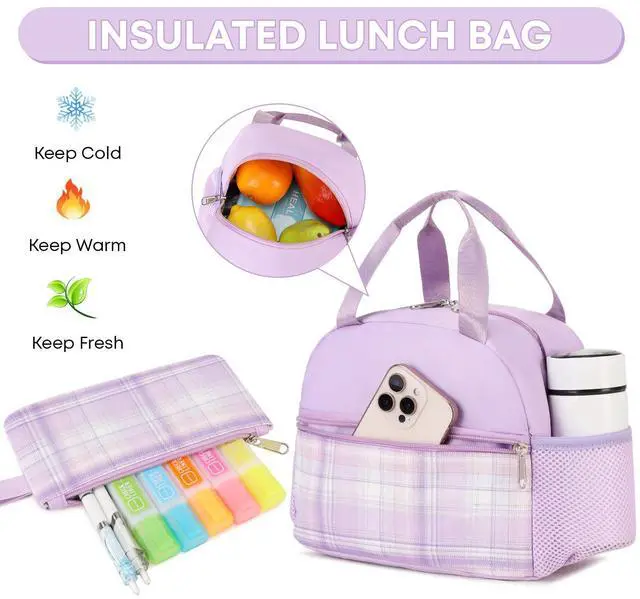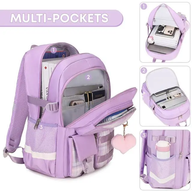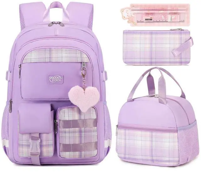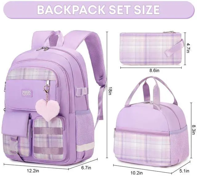 qodbopack 3PCS Student Backpack For School Women College Middle High Teen Girls Bookbag Waterproof Laptop Bag Plaid Purple