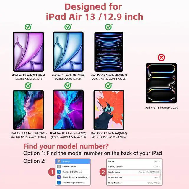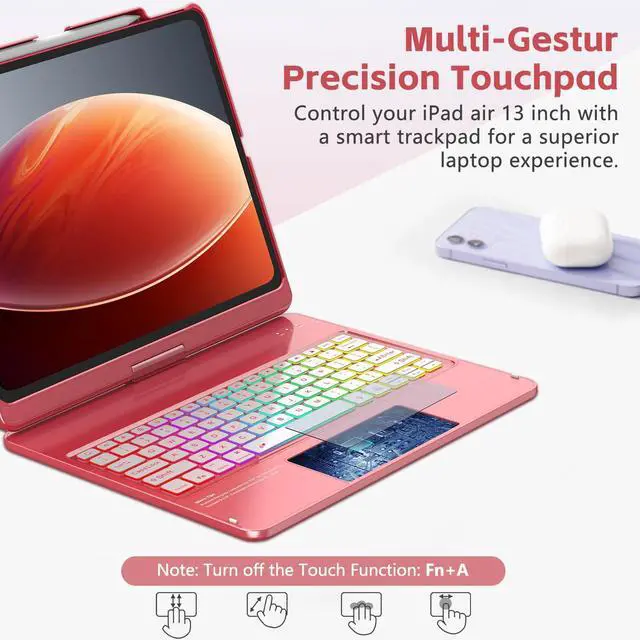 360° Swivel Touch Keyboard Case for iPad Air 13 inch: This Touchpad for iPad air 13 inch case keyboard support 360° Rotatable. Compatible with iPad Air 13 inch M3 2025 (Model Number: A3268 A3269 A3271) and for iPad Air 13 inch M2 2024 (Model Number: A2900 A2899 A2898) and for iPad Pro 12.9 inch 6th Generation (Model Number: A2436 A2437 A2764 A2766) and for iPad Pro 12.9 inch 5th Generation (Model Number: A2378 A2379 A2461 A2462) and for iPad Pro 12.9 inch 4th 3rd Generation (Model Number: A1876 A1983 A1895 A2014 A2229 A2069 A2232 A2233); Please be kindly check your tablet back model before purchasing
