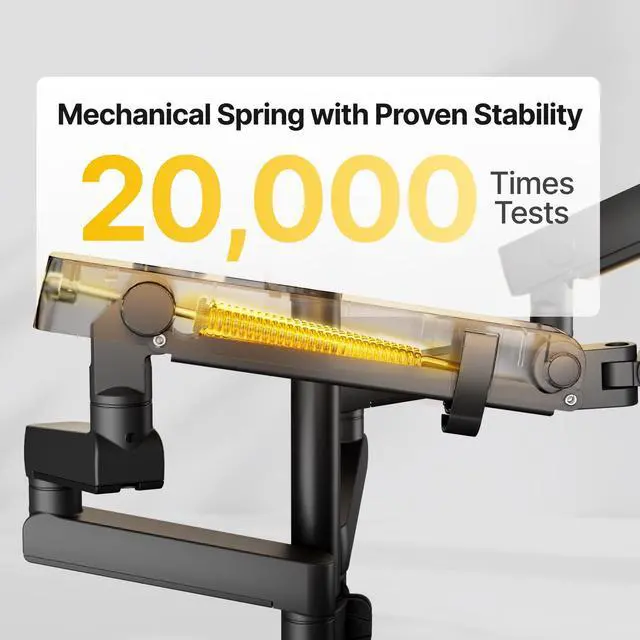 EXCEPTIONAL STABILITY - THE ULTIMATE EXPERIENCE: Our triple monitor mount is built for unmatched stability, elevating both work and play. Crafted from aerospace-grade aluminum with durable gas spring arms, it supports up to 19.8 lbs per arm without sagging or wobbling. Each arm is rigorously tested through 20,000 lift cycles to ensure long-lasting performance and reliability. Trust our three monitor stand to keep your displays safe and steady!