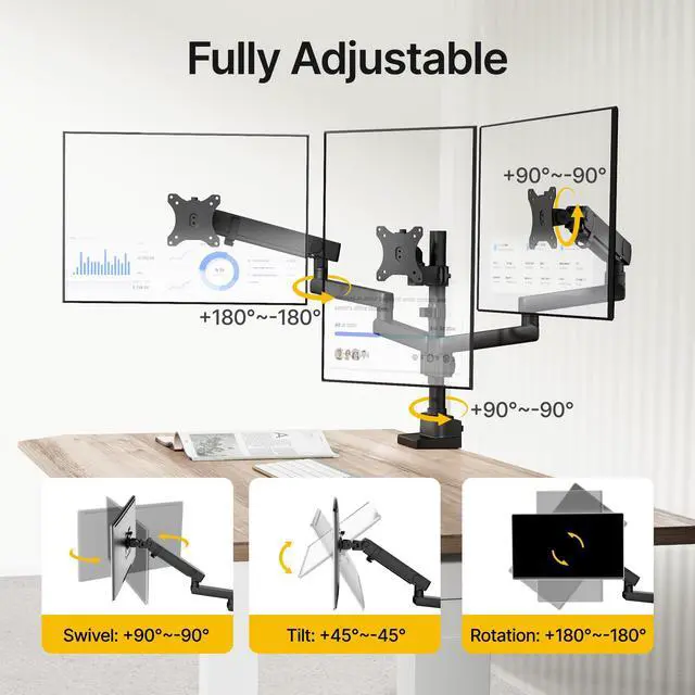 FULL-RANGE ADJUSTABILITY - OPTIMAL VIEWING ANGLES: Our 3 monitor desk mount offers unparalleled flexibility, featuring 360° rotation, ±90° swivel, ±45° tilt and height adjustment of up to 18.1". Whether you're collaborating in a meeting, delivering a presentation or immersing yourself in gaming, this triple monitor stand lets you customise your setup to suit your needs. Enjoy comfort and convenience every time you use it!