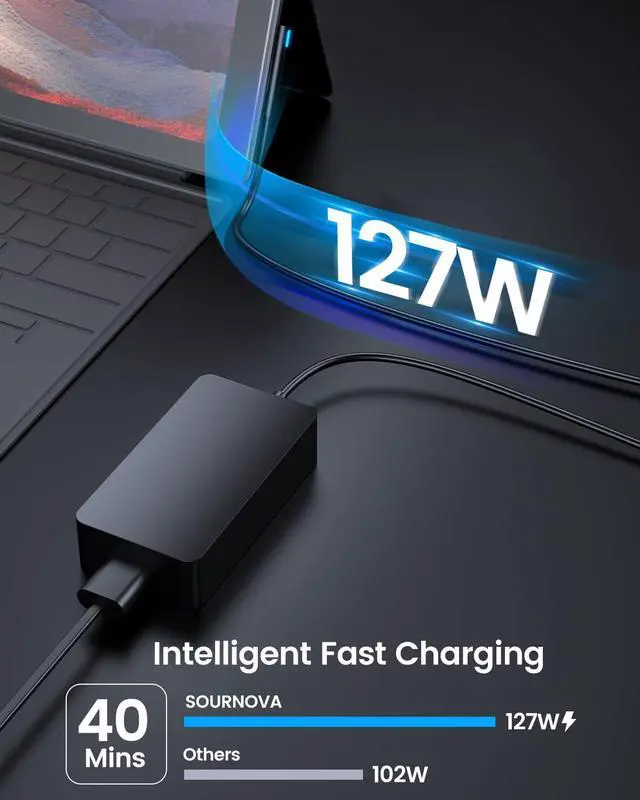 [Fast Intelligent Charging] SOURNOVA Surface book 3 charger maximum output 127W, according to your surface intelligent output 127W, 102W, 65W, 44W, 39W, 36W, 24W, while providing higher charging performance, even when playing can also increase the power