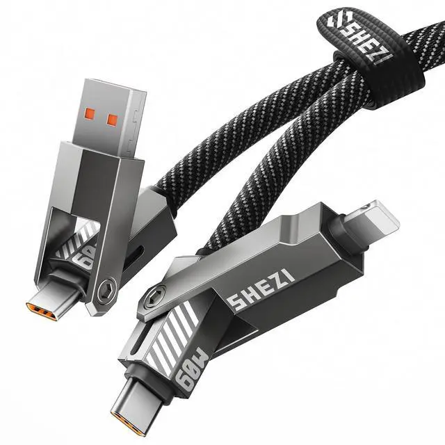 Versatile 4-in-1 Design: SHEZI upgraded 4-in-1 multi charging cable adopts a rocket shape design of multiple ports, which meets your variety of charging needs in one cable.Charge and sync your devices without the hassle of switching between multiple cables. Simplify your charging setup with our versatile 4-in-1 usb-c cable.