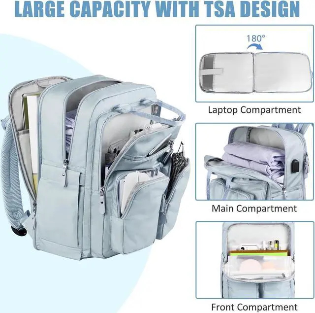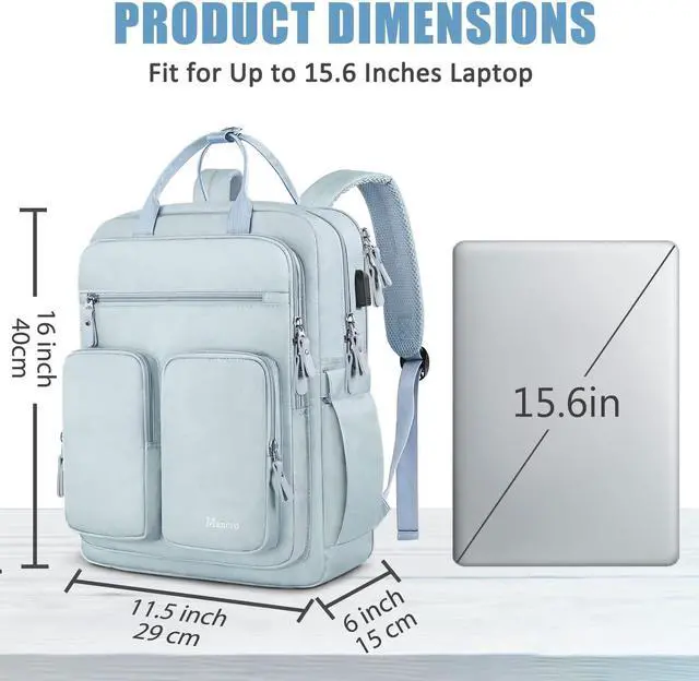 Perfect Size for College and Travel: Backpack size is 16" * 11.5" * 6". The TSA-friendly 180-degree zipper laptop pocket fits 13, 14, 15, up to 15.6 inch laptops securely. This light blue backpack is ideal as a work bag, travel bookbag, or college backpack for women needing practicality, style, and organized storage. It's a great tech gift for women