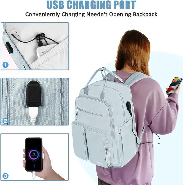 Large Capacity Light Blue Backpack: Mancro light blue backpack for women features a separate laptop compartment for a 15.6-inch laptop, a large main compartment for books, clothes, and other daily necessities. This college backpack with laptop compartment includes a pens pocket and a PVC toiletry pocket in front, keeping your items orderly and easy to find