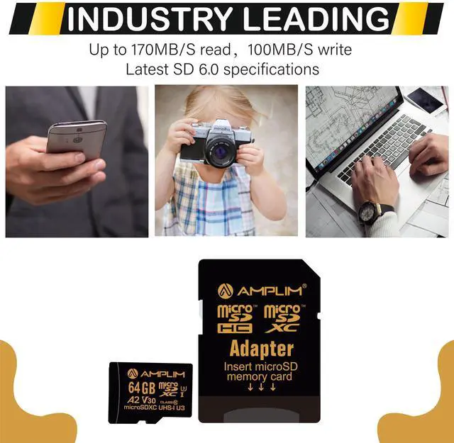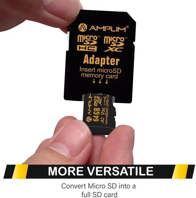 At Amplim, we want you to take more pictures, play more games, work more productive, and store more memories. Whether youre on the trail, on the road, in the office or at home, our versatile Amplim SDXC flash memory card is there for you. The Slim Secure Digital slot adaptor bundle allows you to convert the micro SD card to an SD card for a wide variety of uses. The microSD card works with USB 3.0 /USB3 card reader or thumb drive. Our cards are compatible with any device that requires a Micro SD SDXCcameras, smartphones, e-book readers, drones, or any laptop or computer accessories with a microSD or SD card slot including Kindle, Microsoft Surface, Mavic, DSI, Garmin, Nintendo Switch, DJI, Wyze cam, and others.