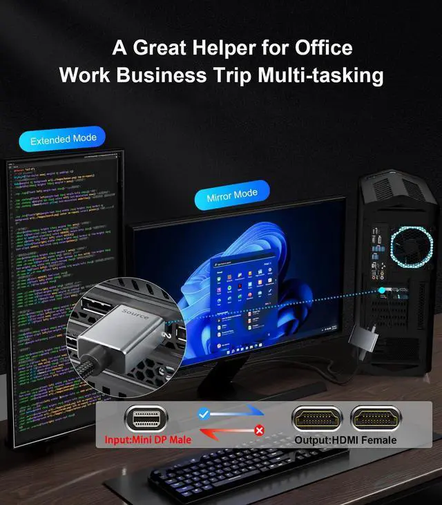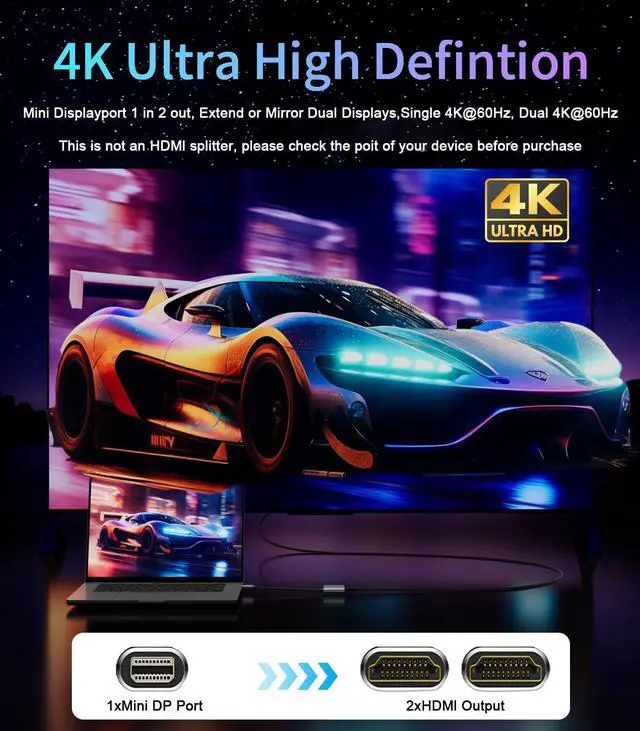 HDMI Adapter: SWITCHFLUX Mini DP to Dual HDMI adapter supports resolutions up to 4K@60Hz, with dual monitors at 3840x2160@30Hz; The dual-display Mini DP adapter also supports 1440p and 1080p at 60Hz via MST technology Connectors Mini DP Gold-plated Male (Input) HDMI ×2 Gold-plated Female (Output)