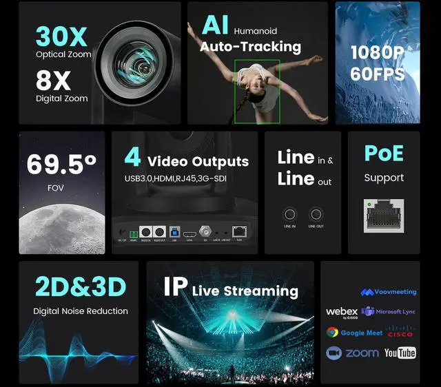 Our full-interface I camera features 30x optical zoom + 8x digital zoom and a 69.5° wide-angle lens, supporting 3G-SDI, HDMI, USB 3.0, and LAN live streaming. It is equipped with a 1/2.8-inch image sensor and 2D/3D noise reduction technology. This PTZ camera is ideal for churches, education, live events, streaming, broadcasting, esports, and houses of worship.