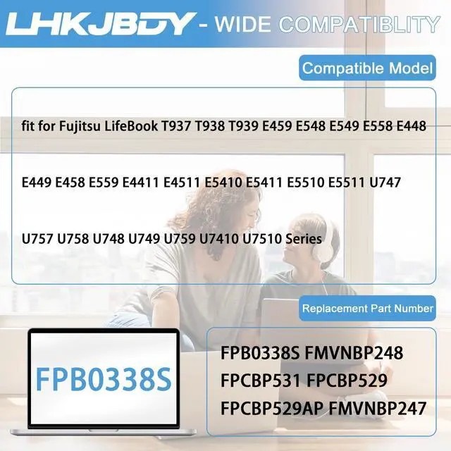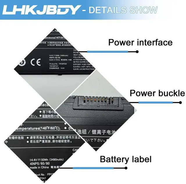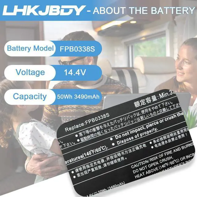 Specifications: Type: FPB0338S; Voltage: 14.4V; Capacity: 3490mAh/50Wh; Color: Black. Battery type: Lithium-Ion; The Packages includes: 1pcs FPB0338S Laptop Battery Replacement, 4pcs Screwdrivers, 1 pcs Instruction for FPB0338S Battery. The batteries are certified by UL and CE, ensuring safety and high performance