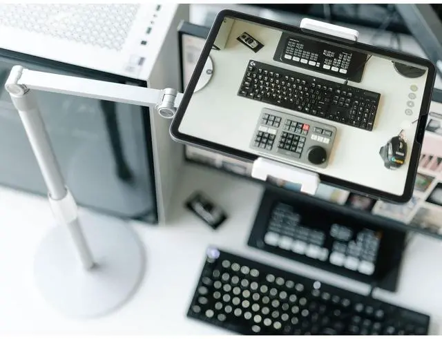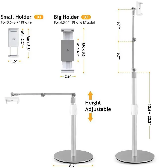 Universal Fit: The overhead phone stand features dual holders that support devices from 3.5 to 11 inches, perfect for teaching, displaying documents, live broadcasting, video recording, and daily tasks.