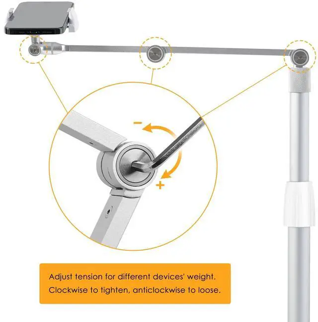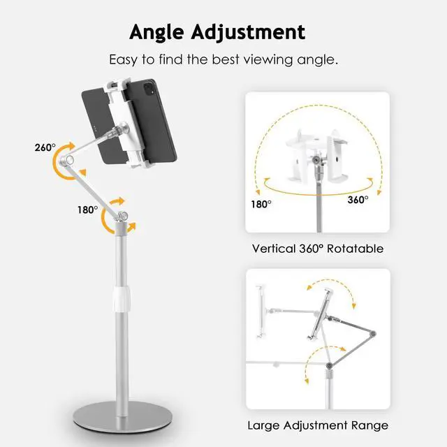 Ergonomic Flexibility: The overhead phone stand offers adjustable height and 360-degree swivel for the perfect viewing angle. The height adjusts up to 9.8 inches, and the arm extends up to 13 inches, reducing neck, shoulder, and back strain.