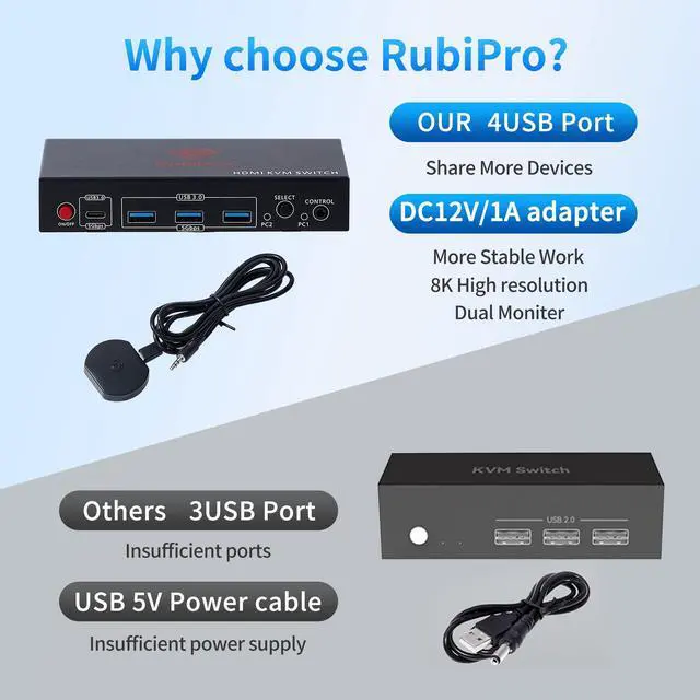 RubiPro 8K HDMI KVM Switch 2 Monitors 2 Computers Dual Display 8K@60Hz, 4K@120Hz, USB 3.0 Fast Data Transfer, Plug & Play for Windows/Mac/Linux with an Additional 8K HDMI Cable